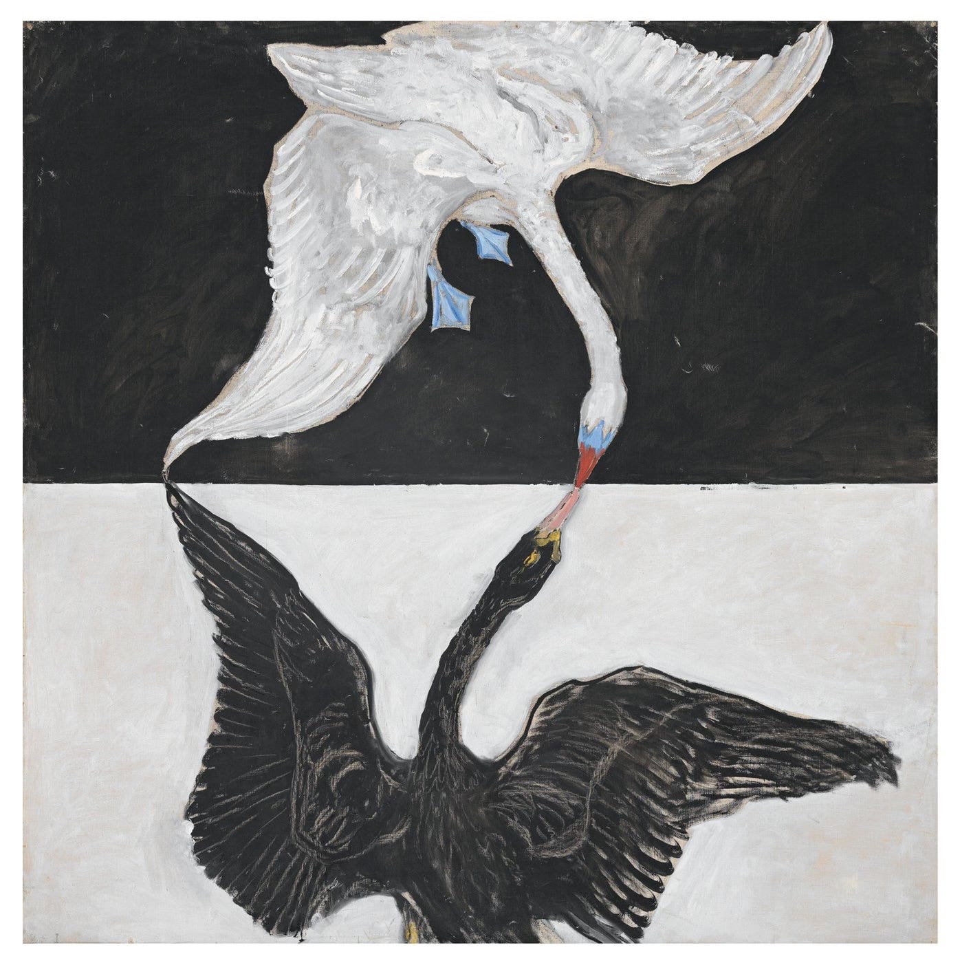 Two birds–one white, one black, caught in the thick brushstrokes,